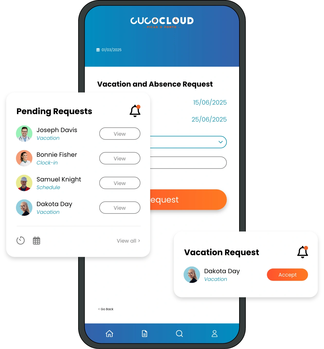 Team management has never been so practical. With CucoCloud, it is possible to approve or reject vacation and time-off requests directly on the platform or the CucoPhone App, facilitating control and the organization of absences in an agile and efficient manner.