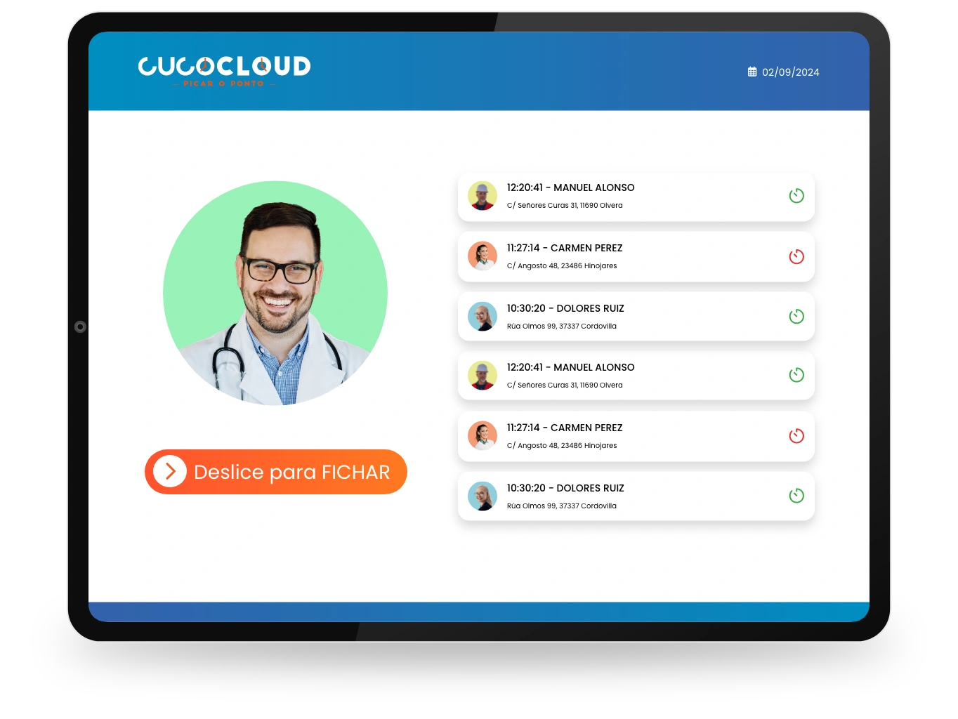 Cada empleado puede fichar directamente desde su área personal en CucoCloud, simplemente introduciendo sus credenciales de acceso de forma rápida y segura.