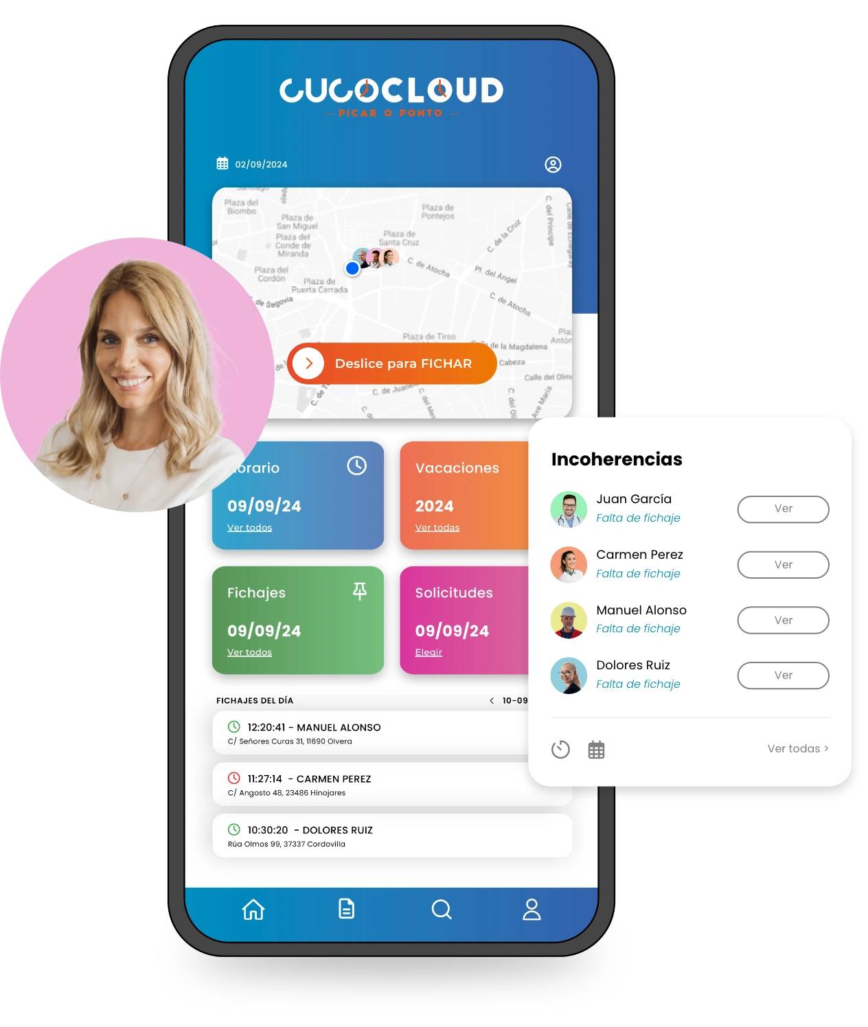 Con CucoCloud, fichar es fácil y rápido. Nuestras apps permiten que los empleados registren entradas y salidas, guardando siempre la ubicación del fichaje.